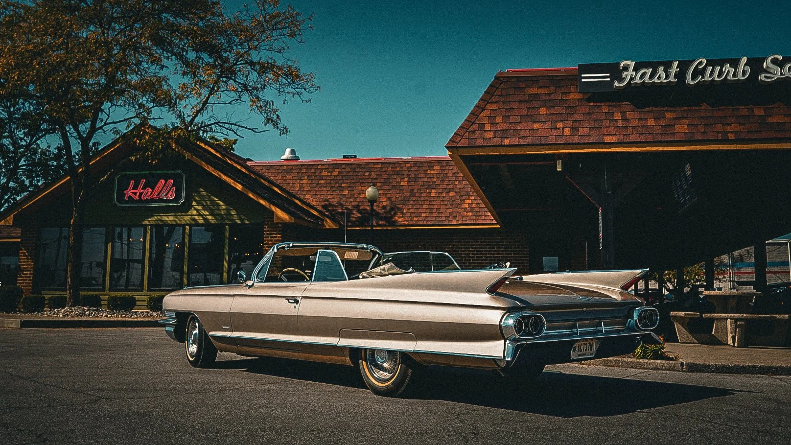 The Fabulous 50s live on forever at Hall’s Hollywood Drive-In! When the Muddy River Run’s in town, all the hotrods head for Hall’s Hollywood, right next to the Roller Dome North at Lima and Coliseum. Just like you remember flash your lights for service and the carhops hang trays of goodies right on the driver’s door!